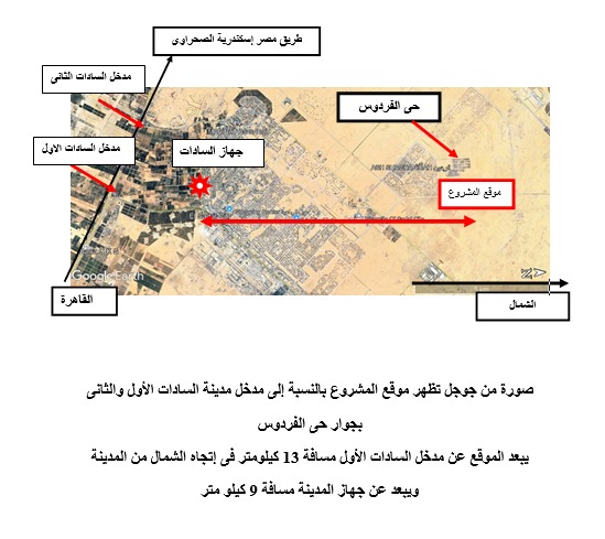 يقع المشروع شمال مدينة السادات بجوار حى الفردوس